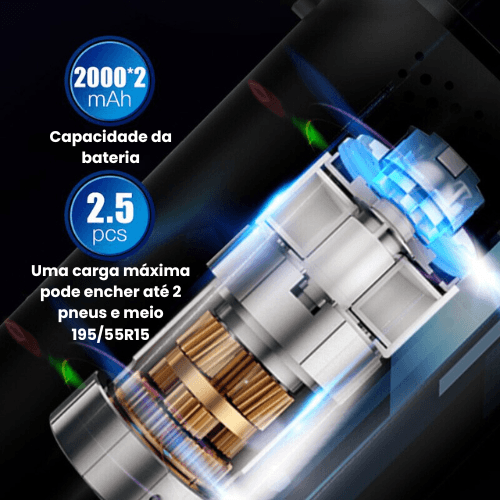 Com uma pressão máxima de 150 PSI e um diâmetro de cilindro de 17 mm, este compressor é potente o suficiente para encher pneus de carros, bicicletas, motos e até mesmo itens esportivos, como bolas de futebol. A capacidade da bateria de 2000 mAh x2 garante longa duração e eficiência.